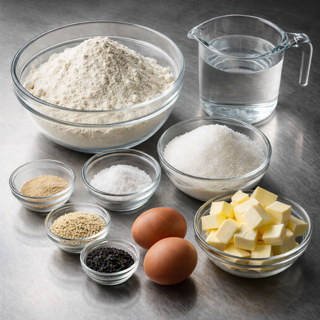 מכניסים לקערת מיקסר או קערה גדולה את הקמח, השמרים, הסוכר, המלח, החמאה והמים.לשים את כל המרכיבים יחד במשך כ-6–8 דקות עד שמתקבל בצק רך, אחיד ונעים למגע.