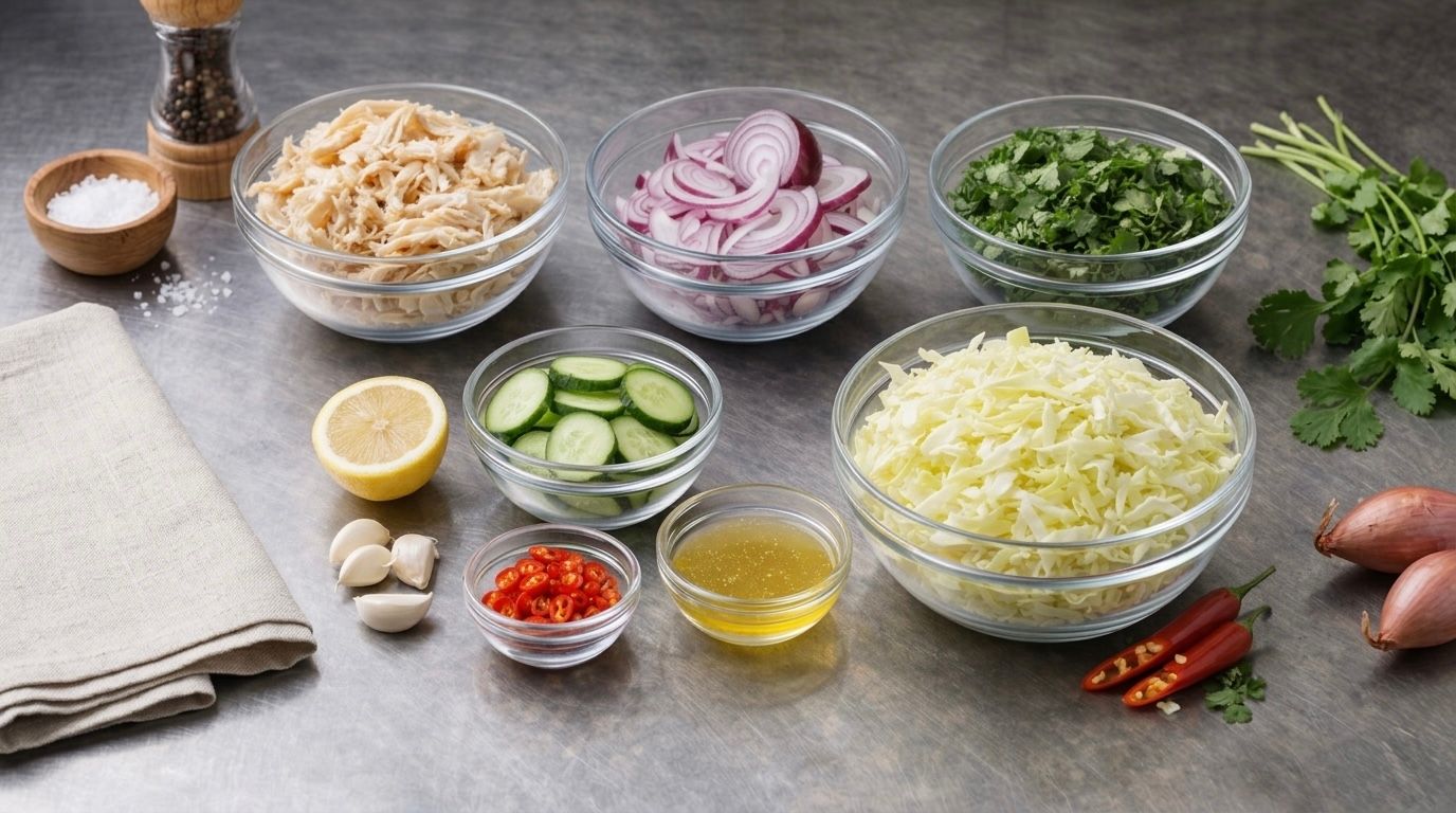 מוסיפים לקערה: עוף מפורק, צ׳ילי פרוס, שארית הכוסברה, מלפפונים,